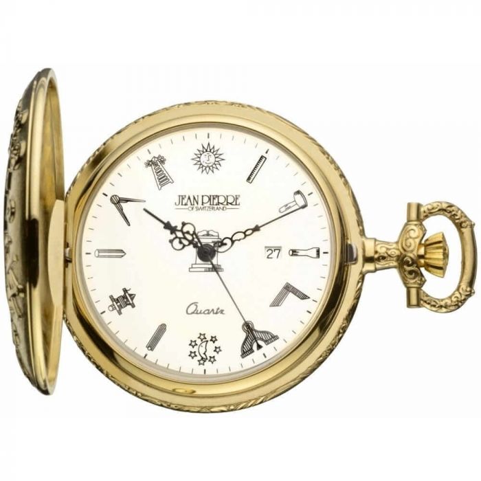 Another beautiful gold plated masonic half hunter quartz pocket by Jean Pierre. The front of the gold plated case has masonic pictures with a window to see the white dial and 3 hand-movement. The back case has a plain back with room for personal engraving. The case opens to a white facing dial with masonic symbols replacing the numbers around the edge and has quartz movement. This pocket watch comes with a matching chain, manufacturers guarantee and a presentation box.