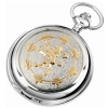 This full hunter pocket watch has a quartz movement and a two tone face with a gold 'rampant lion' on the front. The watch face has Arabic numerals and train track markings with black hands. Includes matching belt bar chain. Engraving opportunities exist on the back case of the pocket watch. Comes in branded packaging with 1 year manufacturers guarantee.